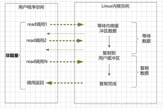(1)在内核数据没有准备好的阶段,用户线程发起IO请求时,立即返回。用户线程需要不断地发起IO系统调用。