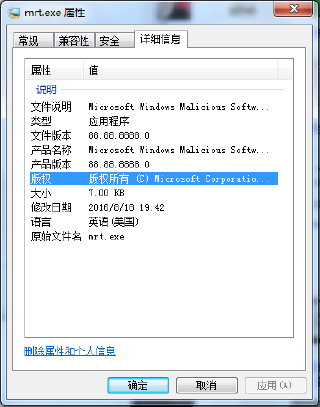 - 小明检查了mrt.exe文件的属性,发现文件大小和版本号都异常。