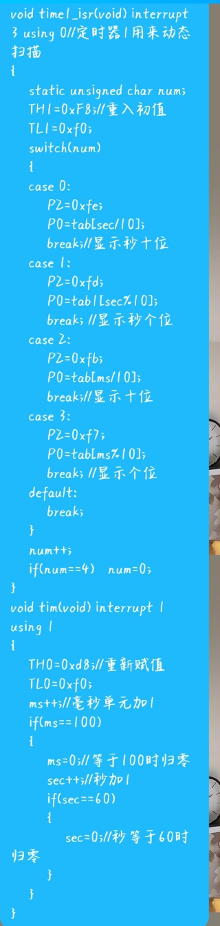 数码管一直闪烁,无论是动态扫描还是静态都是这样。数码管为共阴极,且以三极管为开关焊接的。而且断开电源开关后,数码管有一点微微的亮度,只有断开地线才会完全熄灭。下图为动态扫描以及定时器程序。