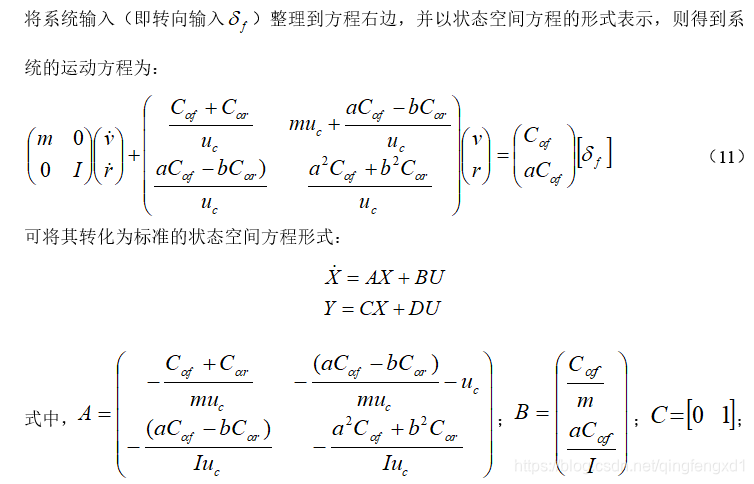 关注汽车以恒速行驶时,汽车只有沿y轴的侧向远动与绕z轴的横摆运动两个自由度。此外,汽车的侧向加速度限定在0.4g以内,轮胎侧偏特性处于线性范围。图1所示为一个由前后两个侧向弹性的轮胎支撑于地面、具有侧向及横摆运动的线性二自由度汽车模型,其运动方程为: