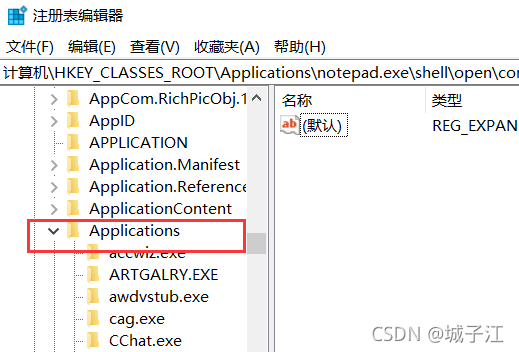 2.找到Applications,依次找到notepad.exe--shell--open--command