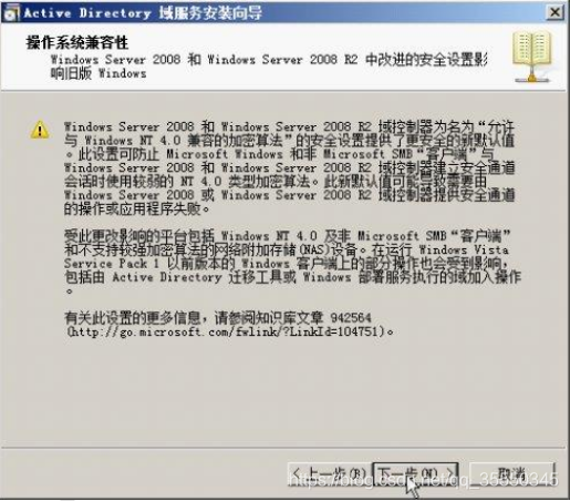 4)单击【下一步】按钮,显示如图1所示【操作系统兼容性】对话框,介绍了Windsows Server 2008中改进的安全设置对旧版Windows的影响。