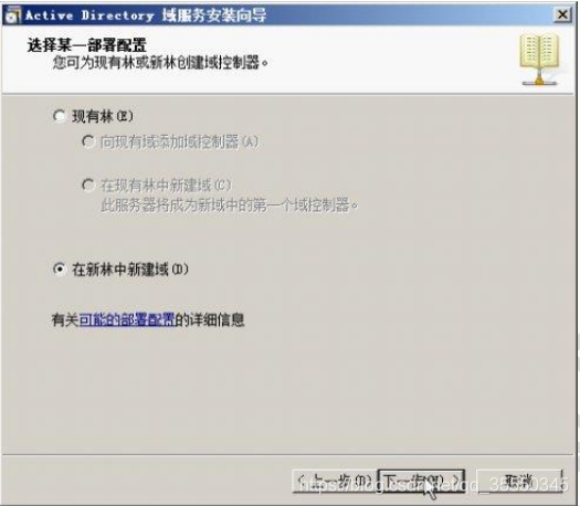 单击【下一步】按钮,在如图所示【选择某一部署配置】对话框。由于该服务器将是网络中的第一台域控制器,因此,选择【在新林中新建域】单选按钮
