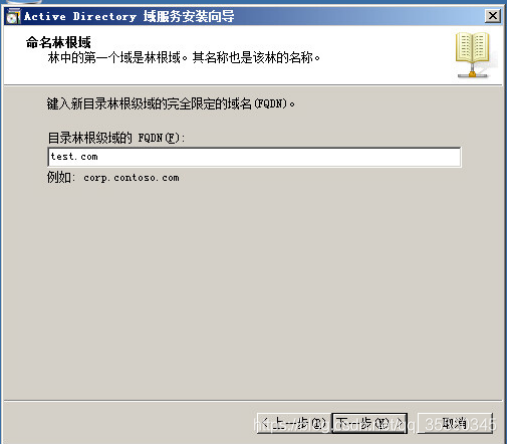 6)单击【下一步】按钮,显示如图所示【命名林根域】对话框。在【目录林根级域的FQDN(F):】文本框中,键入事先规划好的DNS域名