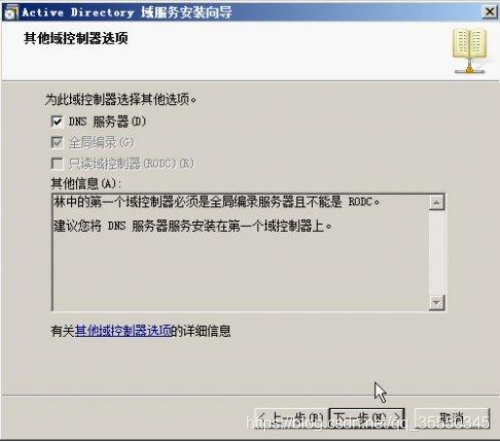 8)单击【下一步】按钮,显示如图所示【其他域控制器选项】对话框,默认选中【DNS服务器】,可以将DNS服务器安装在该域控制器上。由于域中的第一个域控制器必须是全局编录服务器,因此,“全局编录”选择为必选项且为不可更改状态。