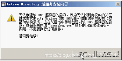 9)单击【下一步】按钮,开始检查DNS配置,并显示如图所示的警告框,提示没有找到父域,无法创建DNS服务器委派。