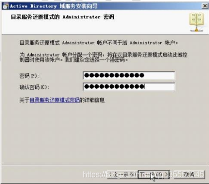 11)单击【下一步】按钮,显示如图所示【目录服务还原模式的administrator密码】对话框,设置登录【目录还原模式】的管理员账户密码。该密码必须设置,否则无法继续安装。