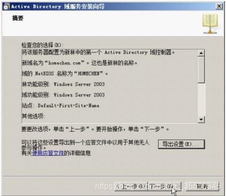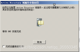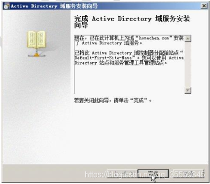 14)配置完成后,显示如图所示【完成Active Directory域服务安装向导】对话框,提示Active Directory域服务安装完成。