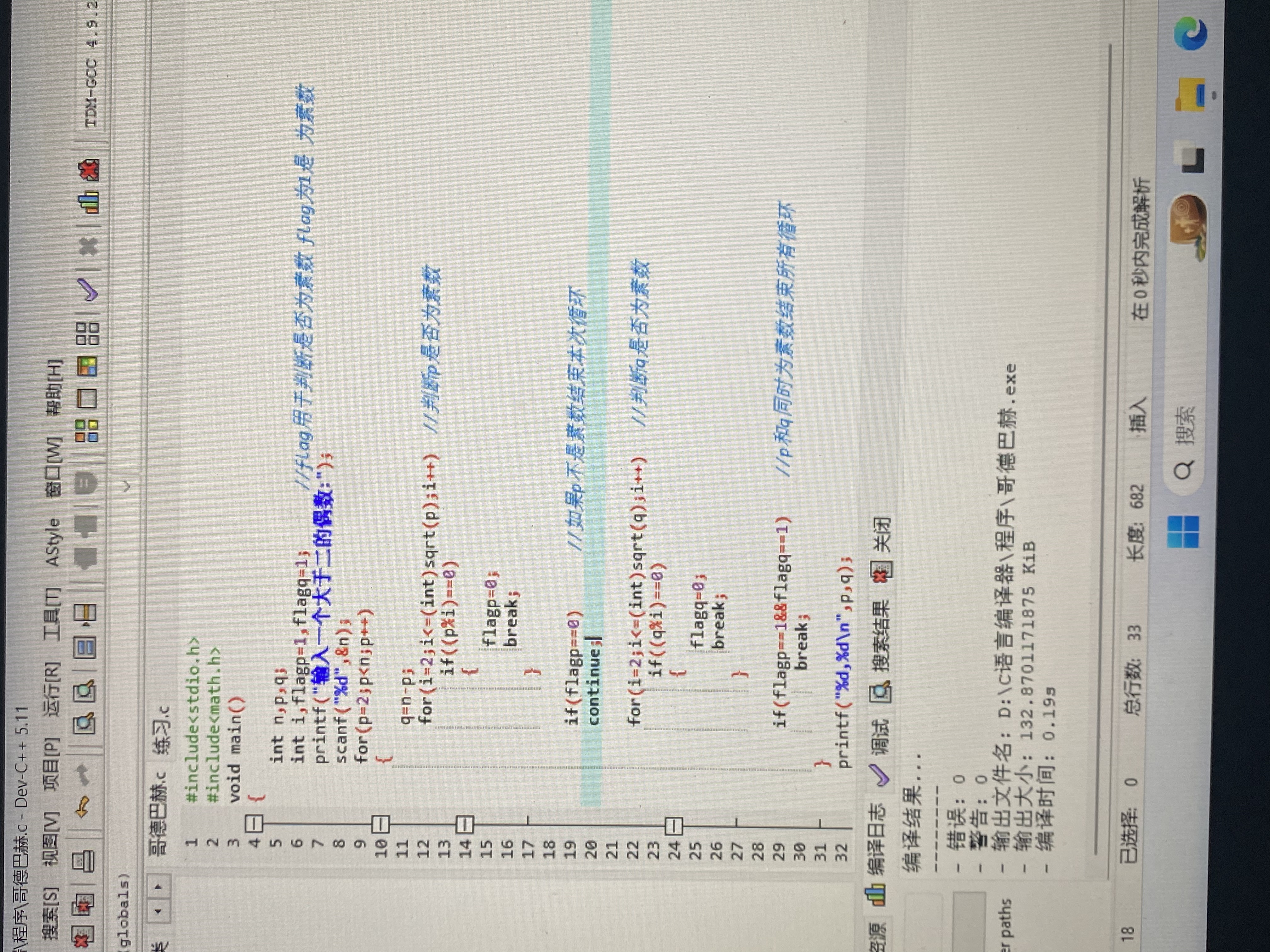 以下是我对代码的大致修改:#include<stdio.h> #include<math.h> int main() { int n, p, q; int flagp = -1, flagq = 1; // flag needs to be initialized printf("请输入一个大于2的偶数:"); scanf("%d", &n); for (p = 2; p < n; p++) { // test for prime number for (int i = 2; i <= sqrt(p); i++) { if (p % i == 0) { flagp = 0; break; } } if (flagp == 0) { continue; } else { break; // if p is prime, no need to test q } } for (int i = 2; i <= sqrt(n - p); i++) { // test for prime number if (n - p % i == 0) { flagq = 0; break; } } if (flagp == 1 && flagq == 1) { printf("%d\n", p); } else { printf("没有找到两个都是质数的数\n"); } return 0; }本回答被题主选为最佳回答 , 对您是否有帮助呢?解决 无用评论 打赏 举报 编辑记录