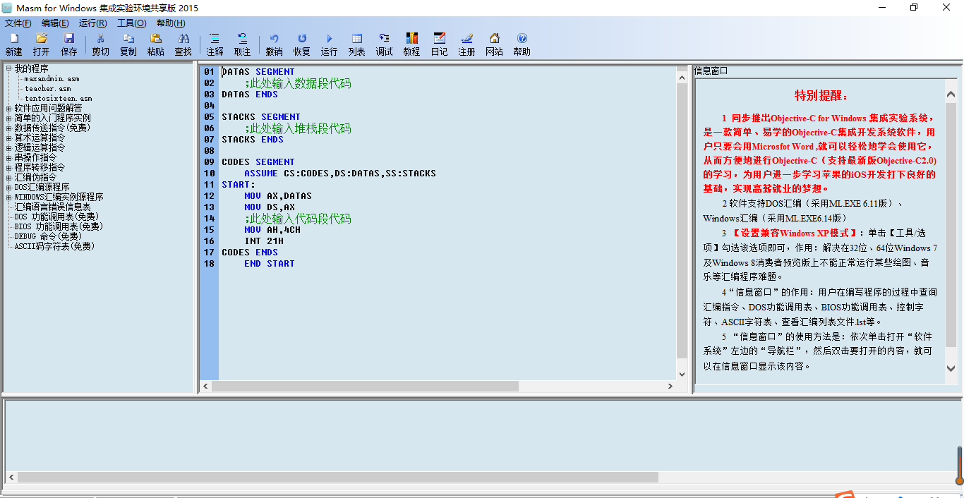 家民集成实验与学习环境系列软件 (jiaminsoft.com)上下载安装。首先打开Masm软件,其界面如下: