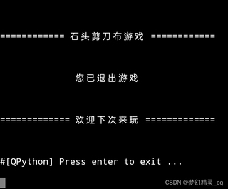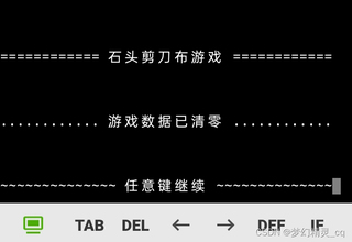 #!/usr/bin/nve python # coding: utf-8 from random import randint # 全局变量 # wins = [0] fails = [0] dogfalls = [0] title = lambda: print(f"\033[2J\n{' 石头剪刀布游戏 ':=^33}\n") def menu(): ''' 游戏菜单 ''' title() # Linux式清屏并打印游戏名称。 strMenu = '石头', '剪刀', '布', '重新开始', '结束游戏' for k,i in enumerate(strMenu): if k in (0, 3): print(f"\n\n{'':>8}", end='') print(f"{k}. {i}{'':>2}", end='') print(f"\n{'':.^40}\n{'(输入对应序号选择菜单)':^30}\n") return input(f"\n\n{'电脑已经确定了出拳且愿与你比试':^25}\n{'':~^40}\n\n{'':>8}您的选择:_") def game(): ''' 游戏 ''' from random import randint ai = str(randint(0, 2)) player = menu() if player == '3': wins[0] = 0 fails[0] = 0 dogfalls[0] = 0 title() input(f"\n\n{' 游戏数据已清零 ':.^33}\n\n\n\n{' 任意键继续 ':~^35}") game() elif player == '4': title() print(f"\n\n{' 您已退出游戏 ':^34}\n\n\n\n{f' 欢迎下次来玩 ':=^34}\n\n") exit() # 退出game函数。 isWindict = {'01': True, '02': False, '12': True, '10': False, '20': True, '21': False } kindDict = {'0': '石头', '1': '剪刀', '2': '布' } if isWindict.get(''.join([player, ai])) is True: flag = '赢' wins[0] += 1 elif isWindict.get(''.join([player, ai])) is False: flag = '输' fails[0] += 1 else: flag = '平' dogfalls[0] += 1 input(f"\n\n{' 本轮结果 ':.^36}\n\n{'':>8}你出的{kindDict.get(player)}{flag},电脑出的{kindDict.get(ai)}\n\n{f'你的战绩:{wins[0]:>3}赢{dogfalls[0]:>3}平{fails[0]:>3}输':^32}\n\n{' 任意键继续 ':~^35}") game() # 调用自己,实现循环游戏。 if __name__ == '__main__': game()本回答被题主选为最佳回答 , 对您是否有帮助呢?评论 打赏 举报 编辑记录解决 1无用
