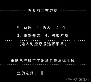 电脑已经确定了出拳且愿与你比试,请输入你的选择:0本轮结果:你出的“石头”平,电脑出的“石头”你的战绩:1赢1平0输