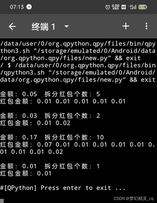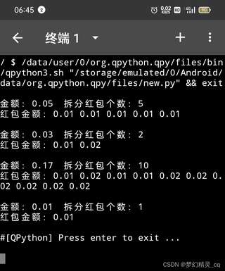 #!/sur/bin/nve python # coding: utf-8 from random import randint def splitRedenvelope(money, num): ''' 拆分红包 ''' if money == num or num == 1: print(*[money/num/100]*num, end='\n') return else: one = randint(1, money - num) print(one/100, end=' ') return splitRedenvelope(money - one, num - 1) if __name__ == '__main__': input_s = '''5 10 3 0.05 5 0.03 2 0.17 10 0.01 1''' data = input_s.split('\n')[1:] for i in range(int(input_s[0])): money, num = data[i].split() print(f"\n金额:{money} 拆分红包个数:{num}\n红包金额:", end='') splitRedenvelope(int(float(money)*100), int(num))感觉问题有些细节,我会将回答抽空整理成学习笔记,了解更多细节,请移步学习笔记。