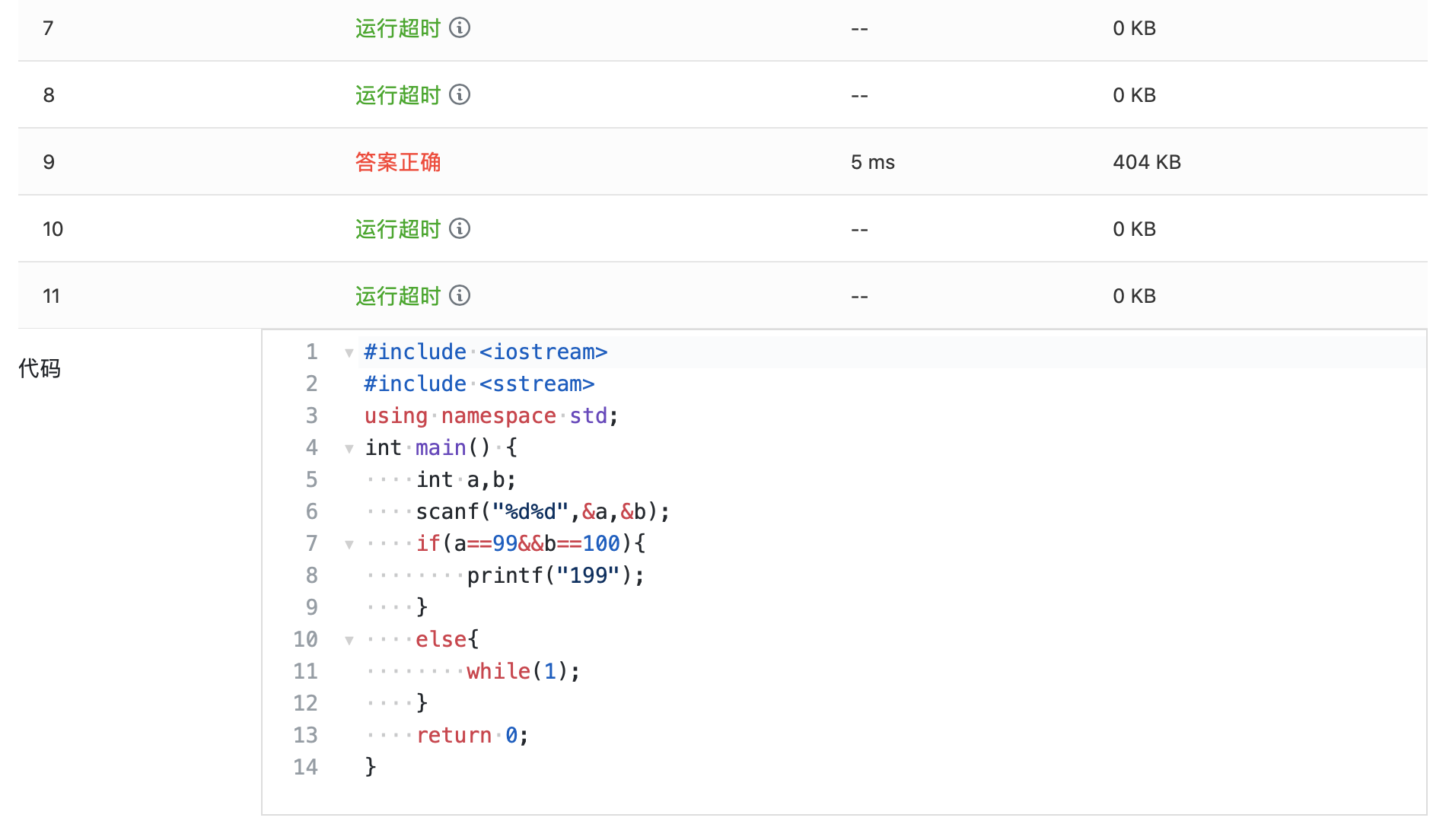 2.如果a>100,会报“运行超时”,因为我们给的就是一个死循环(基于这个基本思路,其实我们也可以利用别的错误,如数组越界,内存溢出等错误)