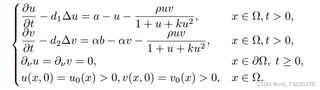 对于v(x,t)的方程: -d2 * ∇²v = ab - av - (i + u + ku²), x ∈ Ω, t > 0 边界条件:v(x,0) = vo(x) > 0