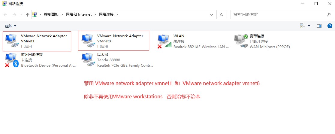 禁用VMware Network Adapter VMnet1 和 VMware Network Adapter VMnet8