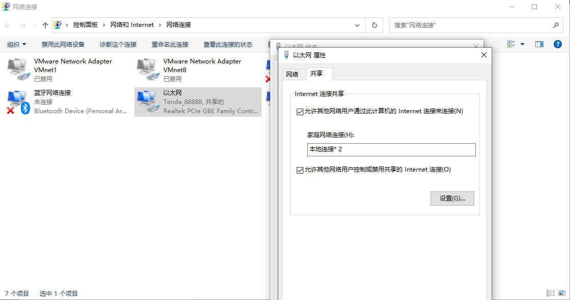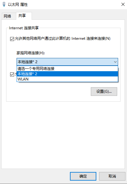 以太网,打开属性——共享——(下拉选择)本地连接。