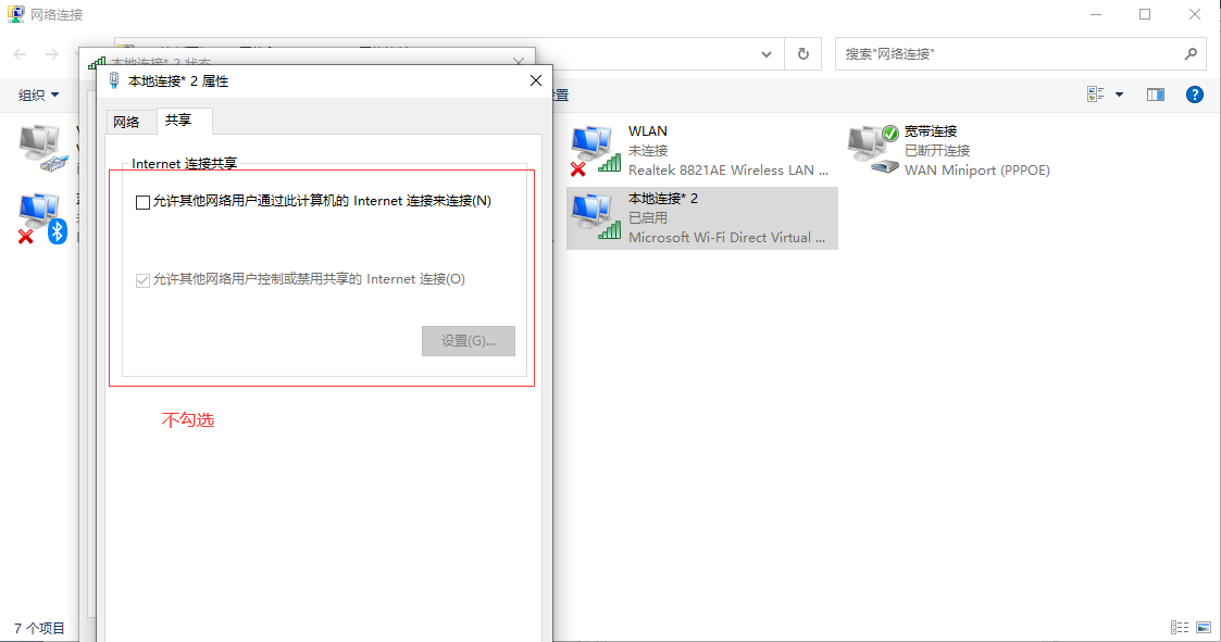 如果没有下拉选项,将“允许其他网络用户通过此计算机的Internet连接来连接(N)” 和 “允许其他网络用户控制或禁用共享的nemnet连接(O) ”取消勾选。