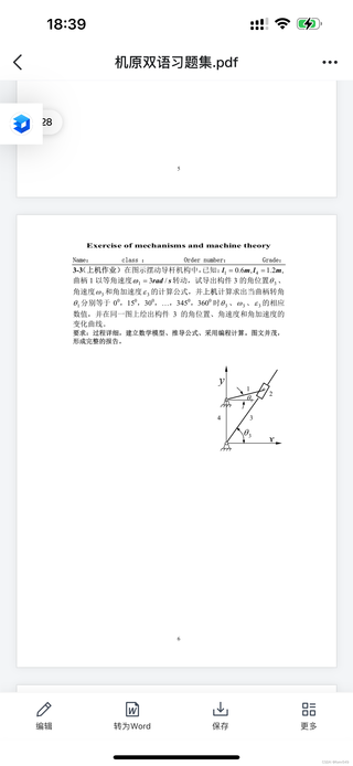 其中,θ1是曲柄转角,ω1=3 rad/s是其角速度,α1是其角加速度(本例中未给定,通常假设为0)。atan2函数用于计算角度,其输入为两个分量,输出为角度值。