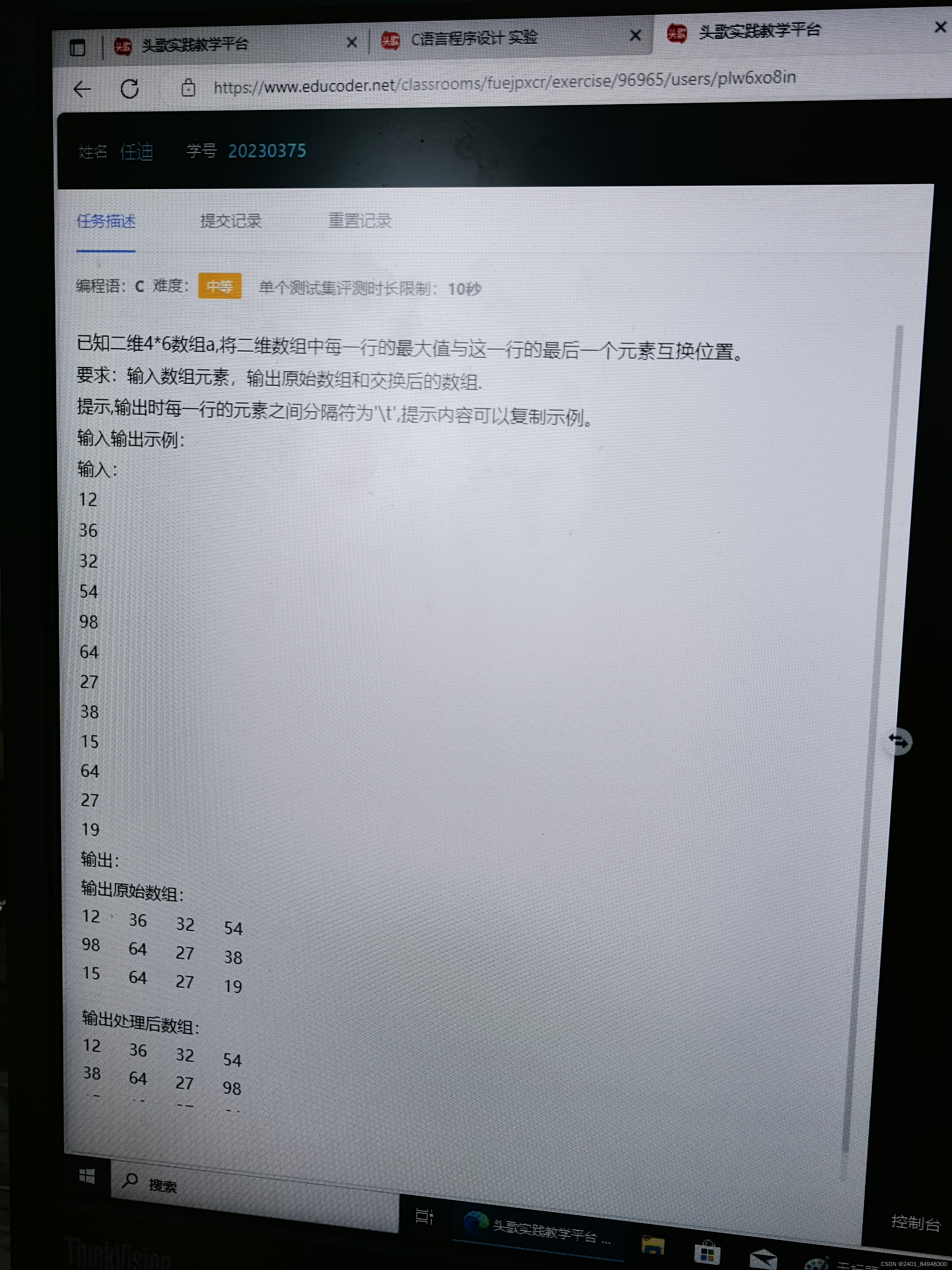 您想要解决的问题是使用C语言编写一个程序,该程序能够接收一个4x6的二维数组的输入,然后将每一行中的最大值与该行的最后一个元素互换位置,并输出原始数组和交换后的数组。