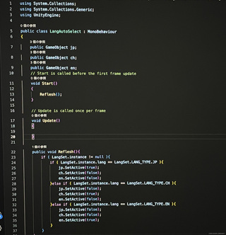 在Assets文件夹下创建一个新的C#脚本,命名为LanguageSwitcher。以下是LanguageSwitcher脚本的基本框架: