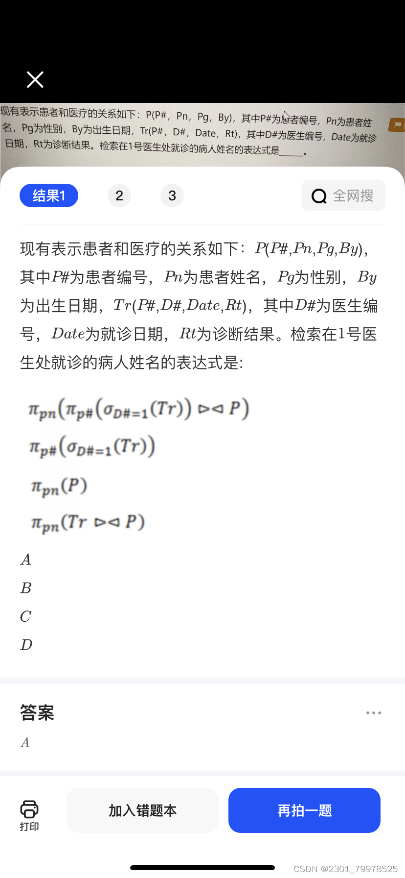 这个表达式的含义是:选择患者姓名(Pn)列,从患者表(P)中选择那些存在与医生编号为1的就诊记录相关联的记录。